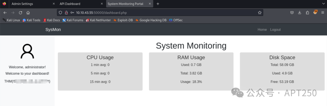 有了它我们能够访问50000端口的sysmon,同时拿到第一个flag