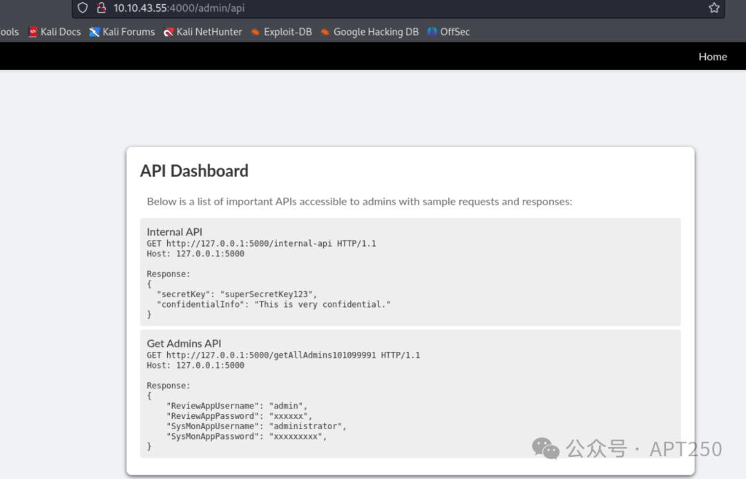 那么思路也很显而易见了,直接访问internal api获取administrator的密码