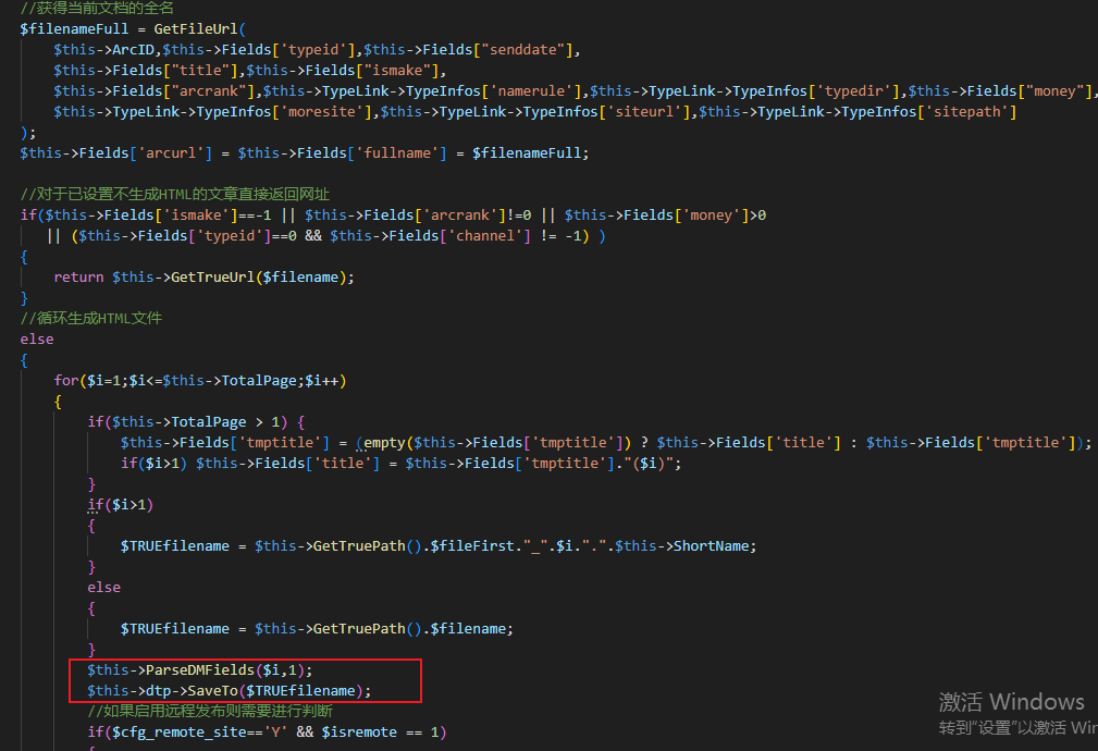 直接看到最后红框中的两个函数。$this->ParseDMFields($i,1);判断哪些模块是需要加载到文章模板中的,并对其进行标记和计算出需要加载模块的数量。方便后续将需要的模块加载到文章中。$this->dtp->SaveTo($TRUEfilename);将模块加载到文章中。跟进saveto()函数