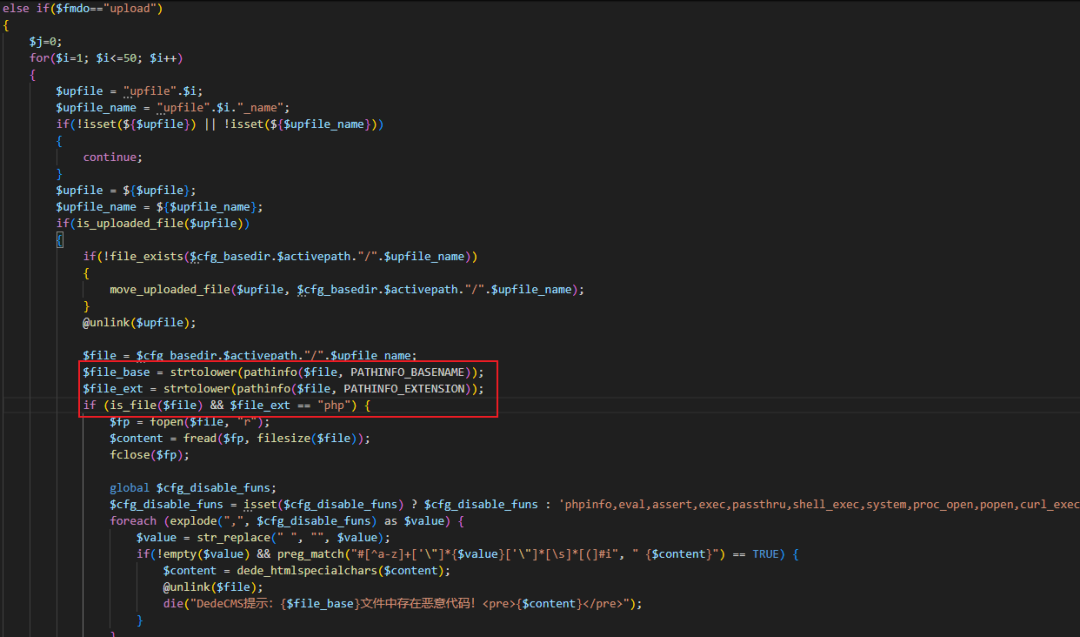 红框前都是对参数的初始化,找到文件临时存放位置,将临时文件保存到本地。之后删除临时文件。红框内$file_base = strtolower(pathinfo($file, PATHINFO_BASENAME));获取文件名$file_ext = strtolower(pathinfo($file, PATHINFO_EXTENSION));获取文件后缀if (is_file($file) && $file_ext == “php”)判断是否为文件和后缀是否为php如果此时一个条件不满足就好跳出后面的内容判断。如果我们上传一个php3为后缀的文件就可以成功(还是有其他访问绕过或使php文件可以执行的办法)。然后通过下面函数改名即可利用。