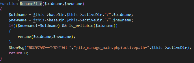 跟进RenameFile函数发现,没有进行过滤新文件名,只判断新旧文件名是否相等和文件是否可写。