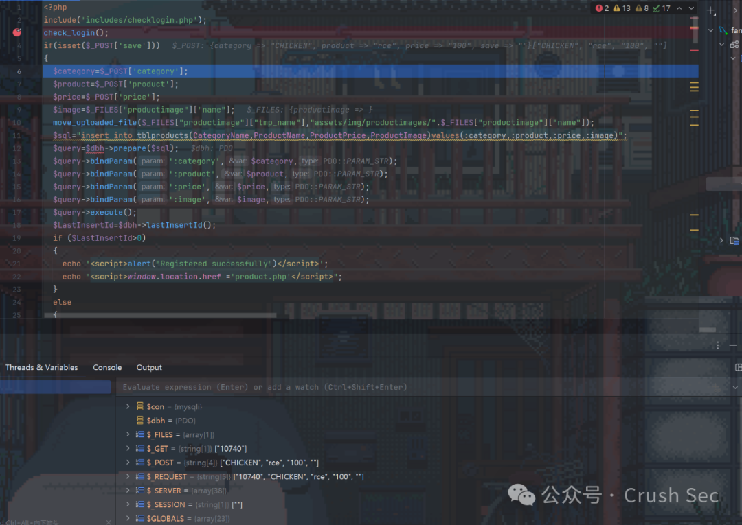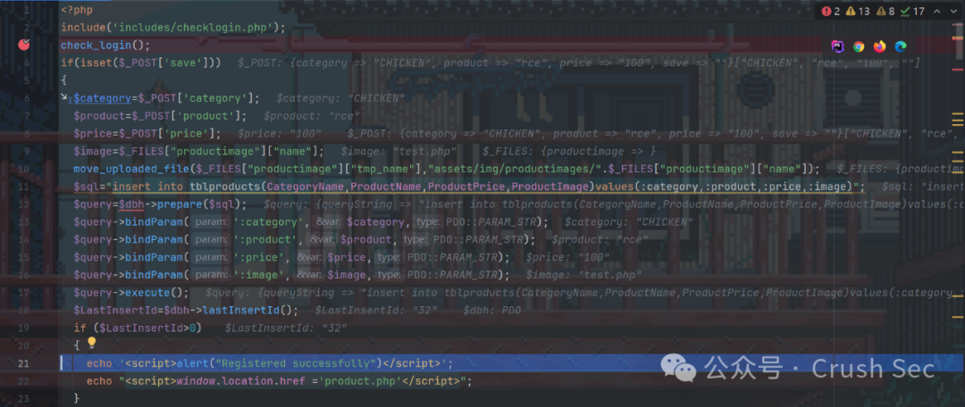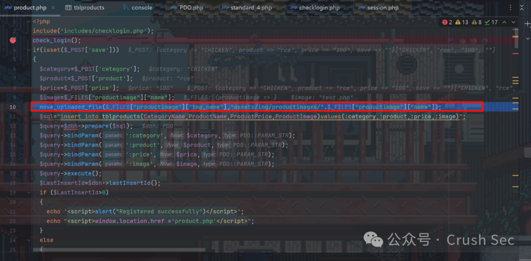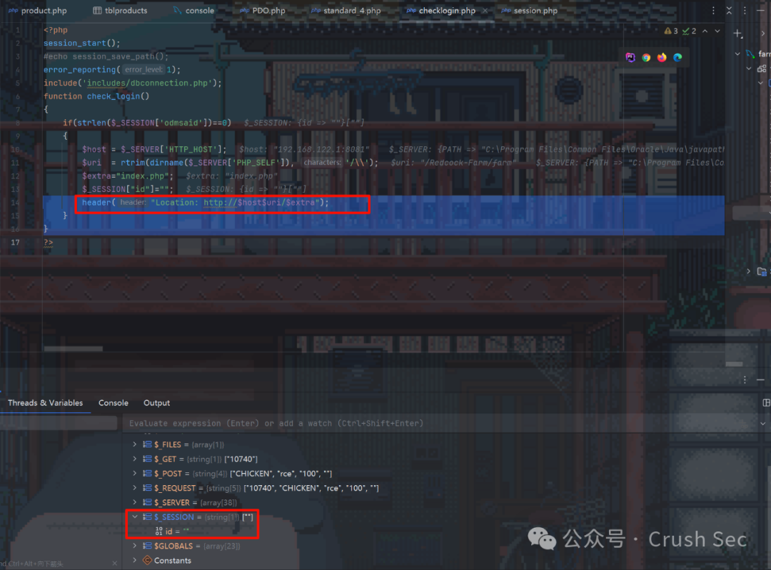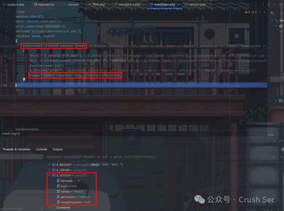 执行到了header(“Location: http://$host$uri/$extra”),此时未登录,所以session也为空。header的作用是进行重定向,重定向到登录页,但是继续往后执行,会发现还是执行到了product.php中的后续代码。