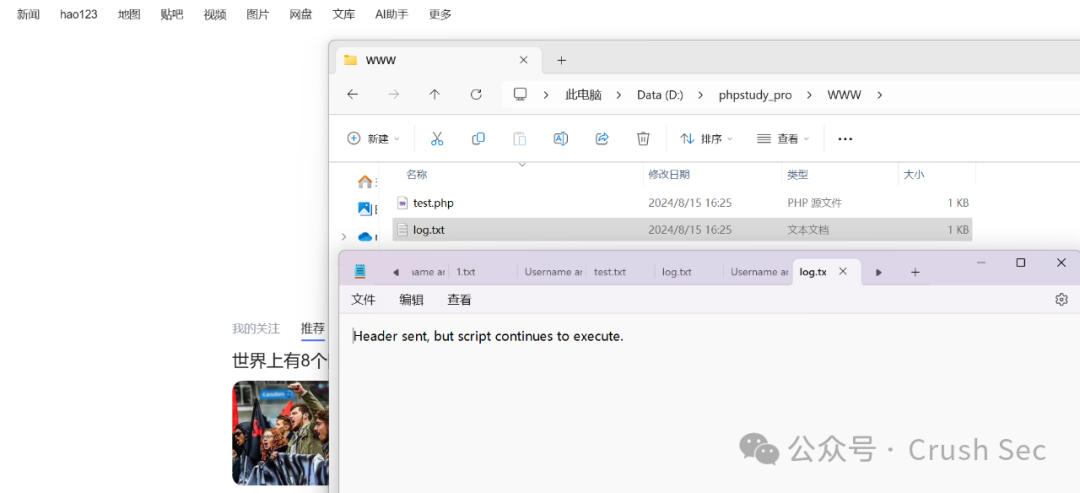 虽然重定向到了百度,但是同时写入文件的代码也被执行了,同理,也就导致了前面的问题。