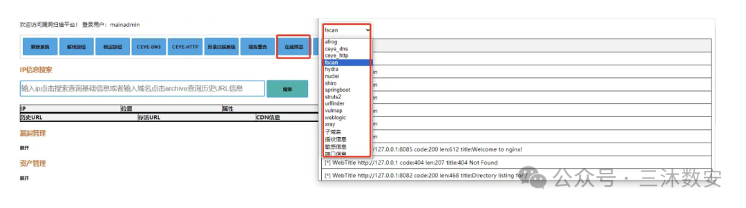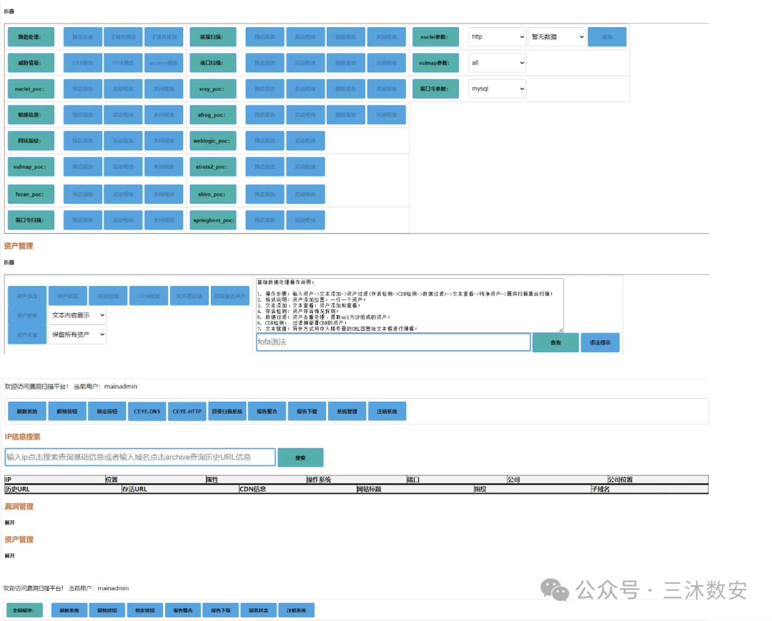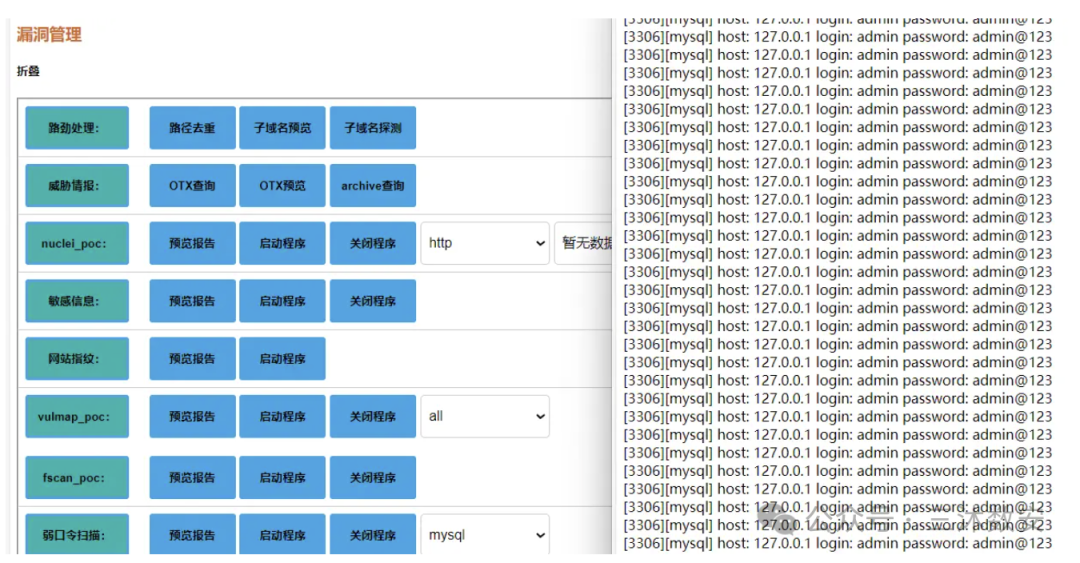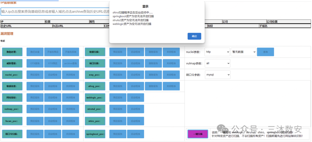漏洞扫描模块:(weblogic、struts2、nuclei、xray、rad、目录扫描、js链接扫描、端口扫描、调用威胁情报抓取历史绑定url、网站指纹、信息泄露、vulmap、afrog、fscan、DNS日志、shiro、springboot、服务弱口令扫描、识别重点资产)