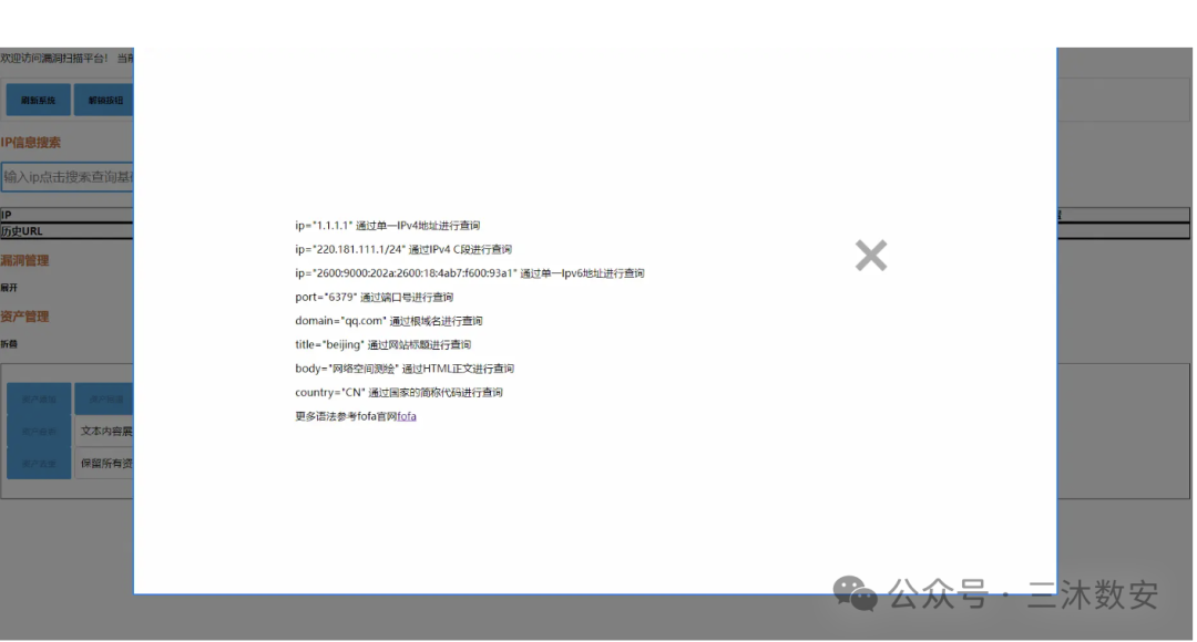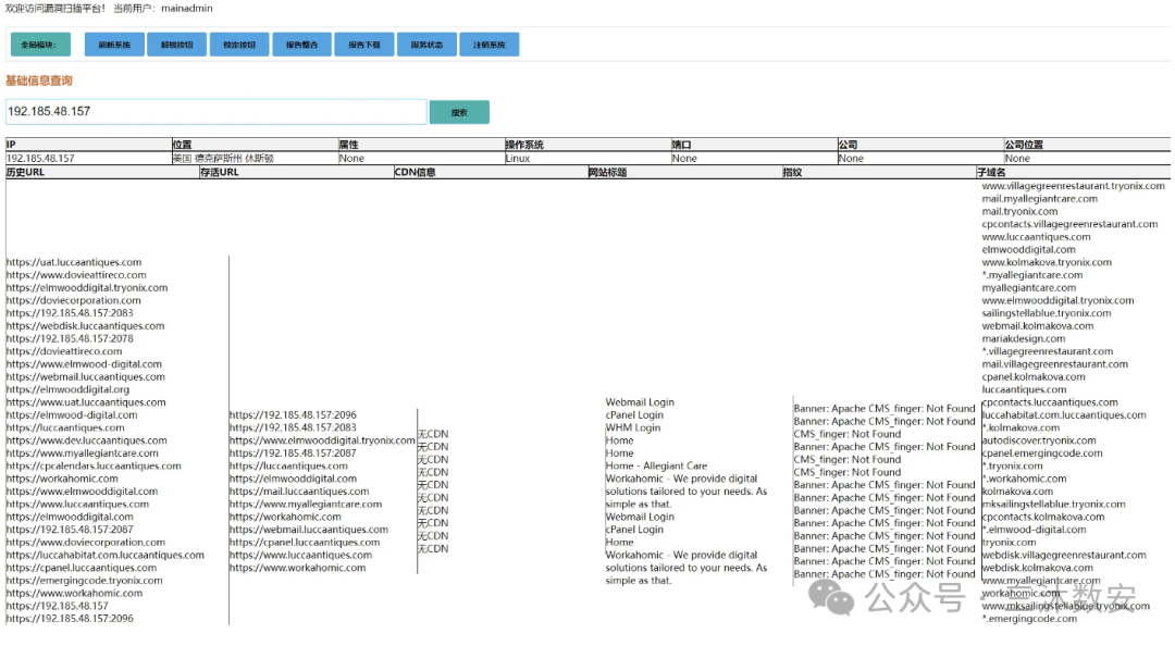 包括IP基础信息探测模块:(位置、属性、操作系统、端口、绑定的域名、公司名称、公司位置信息、网站标题、CDN信息、绑定网站指纹、子域名),