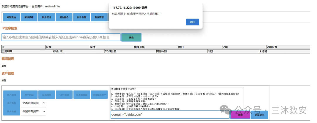 资产管理模块:(资产发现、资产展示、CDN检测、存活检测、资产回退、重点资产识别),单个扫描模块报告支持在线预览,总报告支持下载和预览。