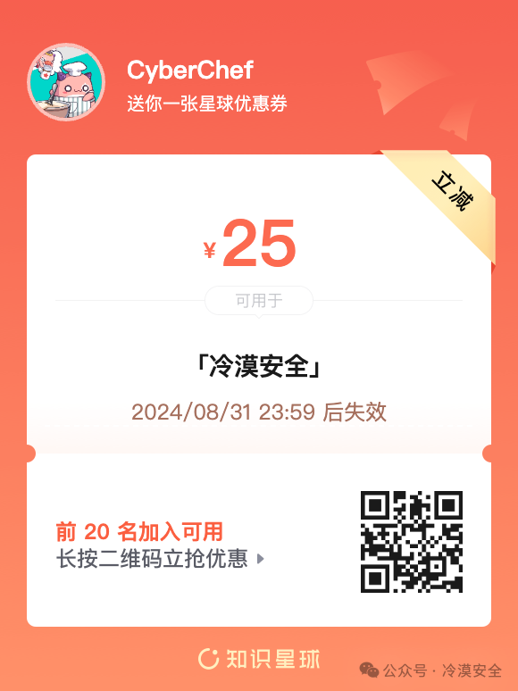 知识星球:冷漠安全交个朋友,限时优惠券:加入立减25星球福利:每天更新最新漏洞POC、资料文献、内部工具等