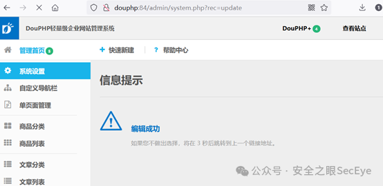 DouPHP 1.7Release20220822版本中存在一个远程代码执行(RCE)漏洞。拥有管理员权限的攻击者可以通过该漏洞在服务器上执行任意命令。漏洞通过上传恶意文件、修改文件扩展名以及通过构造特定的数据包来执行PHP代码。