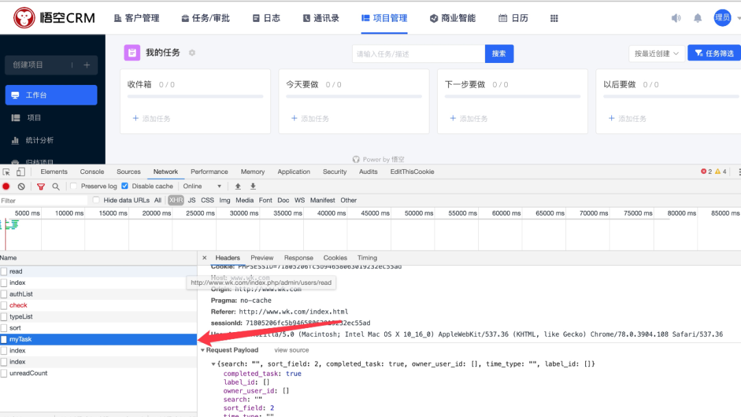 进入到管理操作区,找到项目管理,在所有请求中有一个myTask请求,