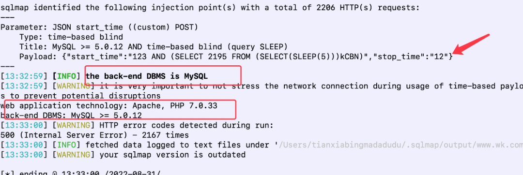 再此方法中接受的参数有start_time、stop_time、user_id三个参数,其实这三个参数都没有加过滤,直接字符串拼接。所以都存在SQL注入点,只不过sqlmap在start_time的时候,就跑出结果了,后面不验证罢了。需要提醒的是,再最新版本中,这个url需要构造出来,而不是点解控制台中哪个url。项目方把这个功能模块去掉了,但是代码并没有删除。简单验证如下图: