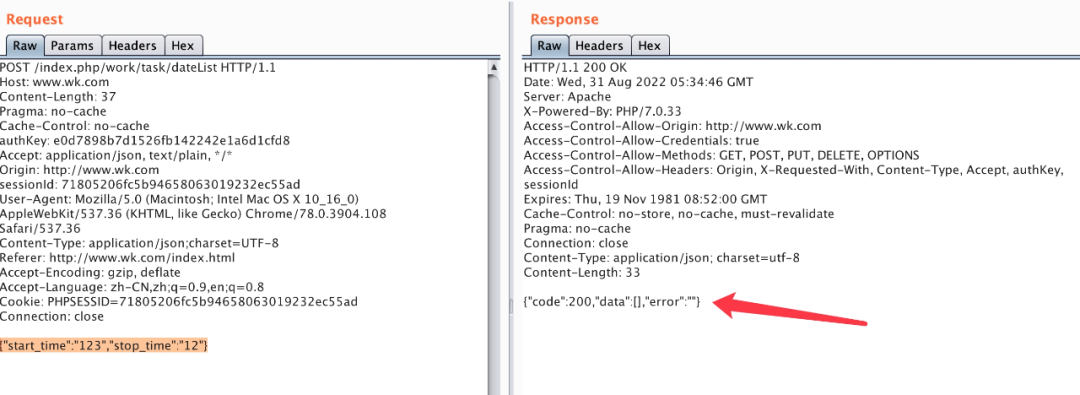 使用burpsuite抓取到改请求,发送到重放模块,接着修改构建传递的参数,第一个将url部分mytask修改成dateList,将body部分的{“search”:””,”sort_field”:2,”completed_task”:true,”owner_user_id”:[],”time_type”:””,”label_id”:[]}修改改成{“start_time”:”123″,”stop_time”:”12″}