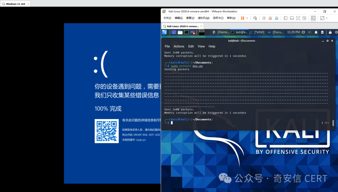 目前,奇安信威胁情报中心安全研究员已成功复现Windows TCP/IP IPv6远程拒绝服务/代码执行漏洞(CVE-2024-38063)****,截图如下: