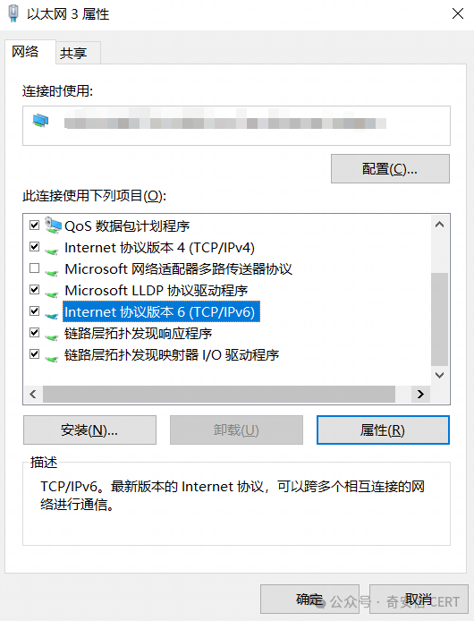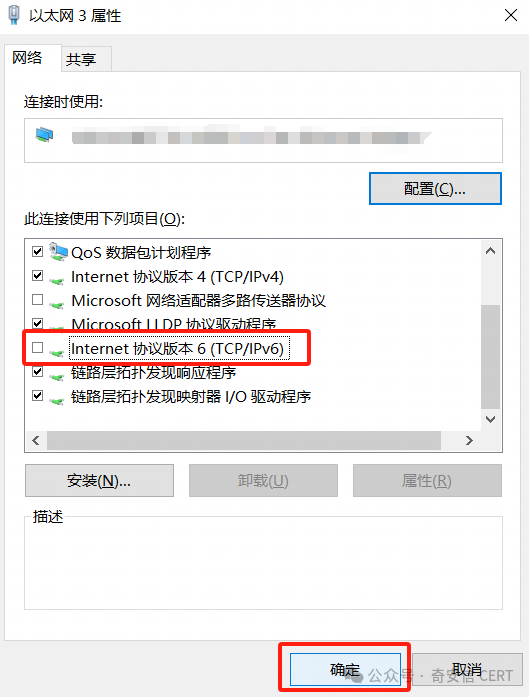 3、在弹出窗口中选择“禁用”IPv6选项,请取消选中该选项,然后单击“确定”保存更改。