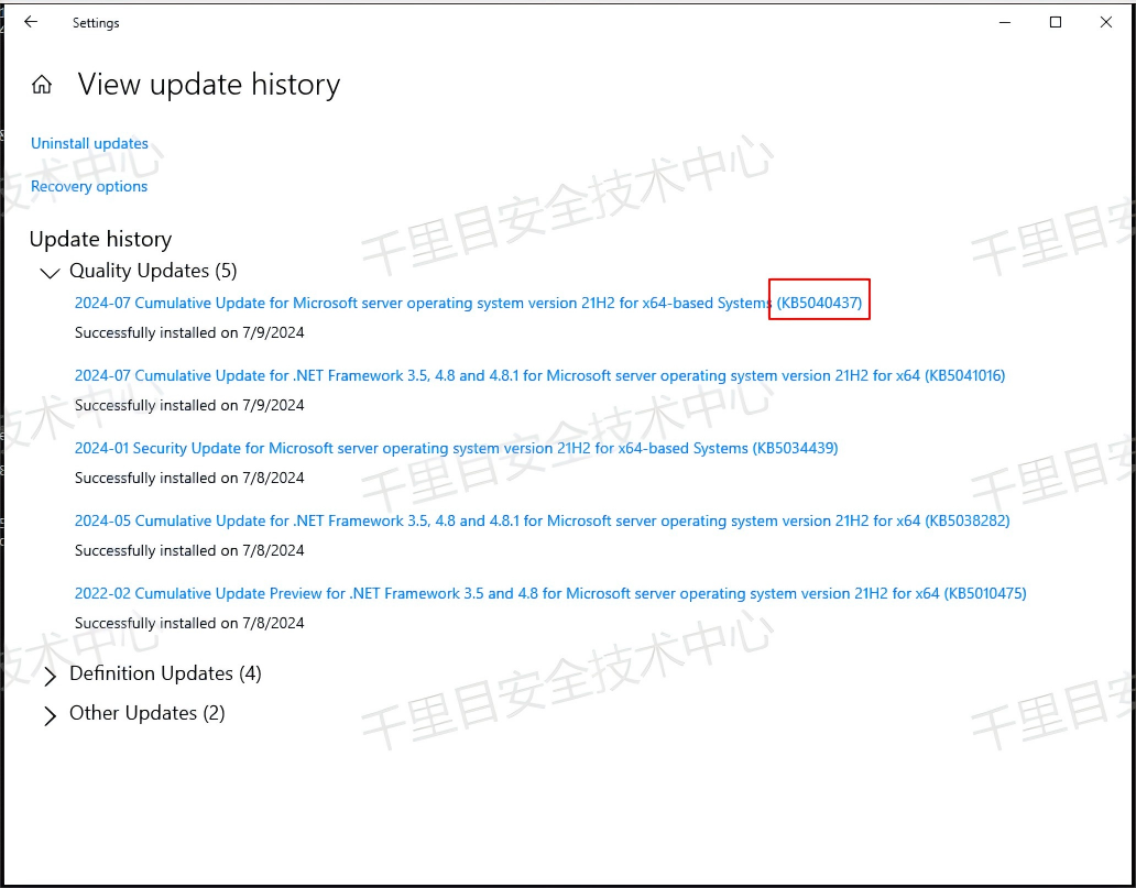 在“设置”-“更新与安全”-”Windows更新”-“更新历史”中检查是否存在以下表格中对应的系统补丁。如果存在以下补丁,则证明漏洞已修复。