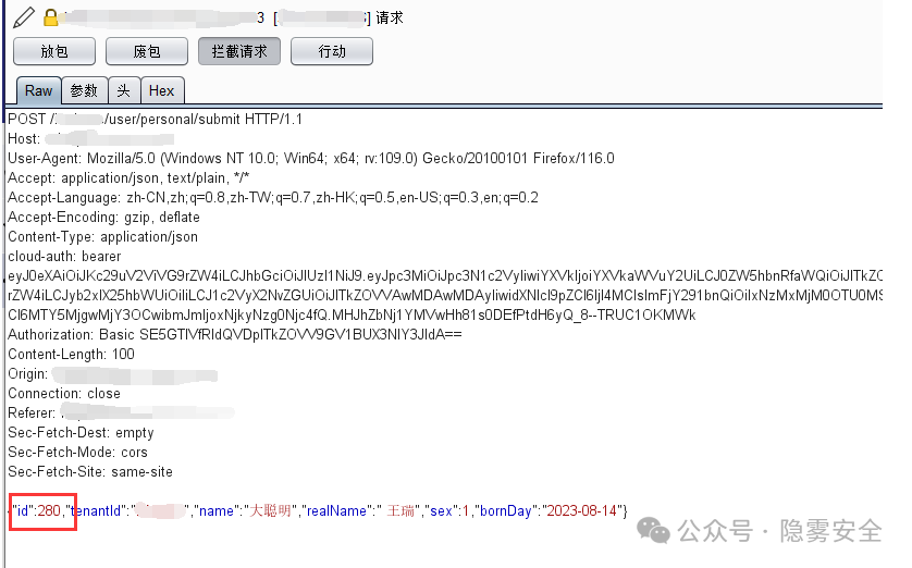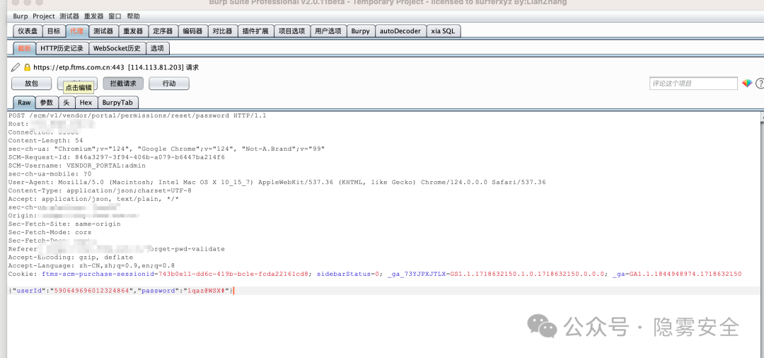 5.拦截请求包。替换请求包中的userid为admin的userid