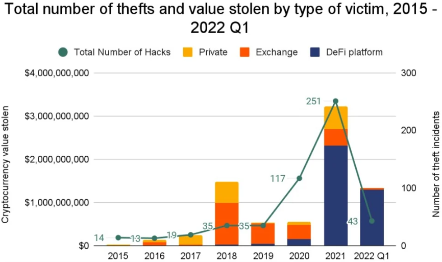 根据Chainalysis数据,2022年第1季度,DeFi加密货币平台频繁成为黑客攻击的目标。2021年,约有25%从DeFi平台窃取的加密货币之后返回给了受害者,而今年没有一起从DeFi窃取的资金返回的案例。