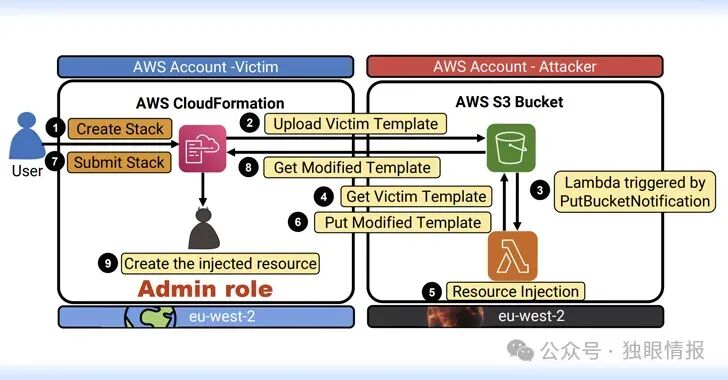 然而,需要注意的是,攻击者必须等待受害者首次在新的区域中部署新的 CloudFormation 堆栈才能成功发起攻击。修改 S3 存储桶中的 CloudFormation 模板文件以创建恶意管理员用户还取决于受害者帐户是否具有管理 IAM 角色的权限。
