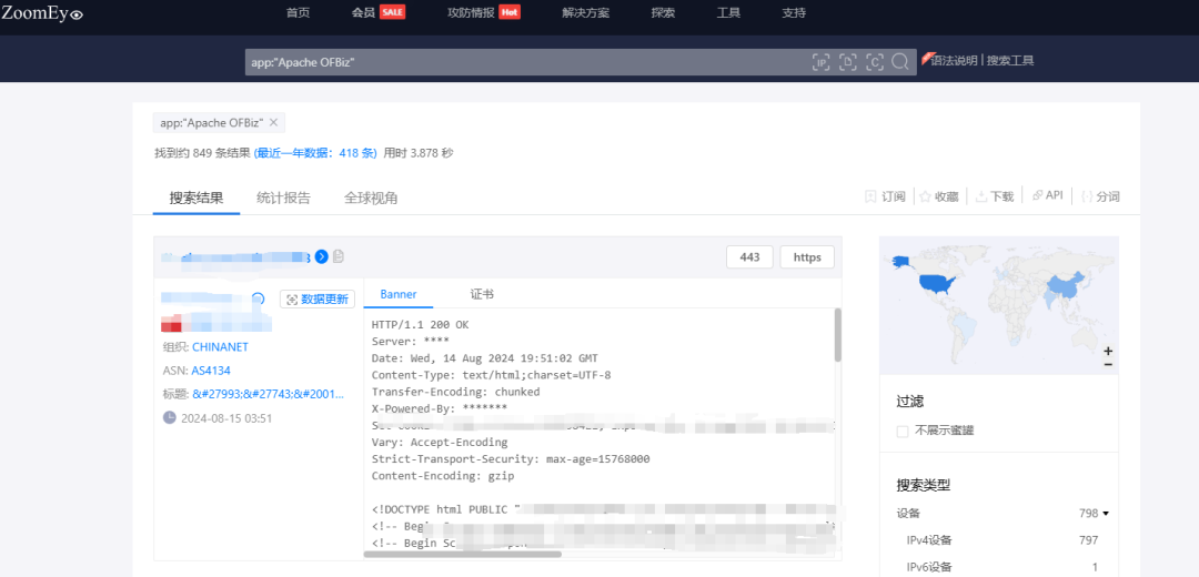 根据ZoomEye网络空间搜索引擎关键字 app:”Apache OFBiz” 对潜在可能目标进行搜索,共得到849条IP历史记录。主要分布在美国、中国等国家。(ZoomEye搜索链接: