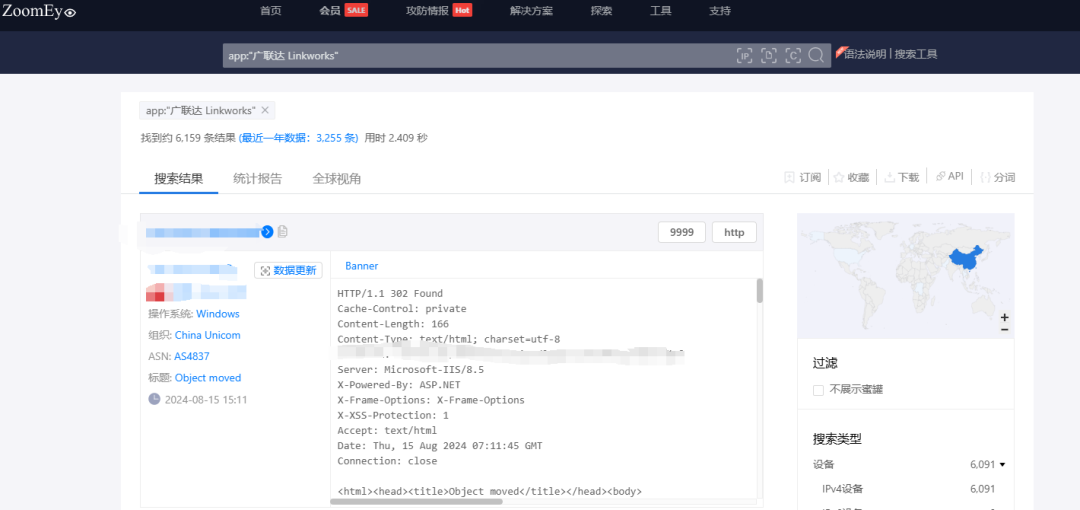 根据ZoomEye网络空间搜索引擎关键字 app:”广联达 Linkworks” 对潜在可能目标进行搜索,共得到6159条IP历史记录。主要分布在中国、巴基斯坦等国家。(ZoomEye搜索链接:
