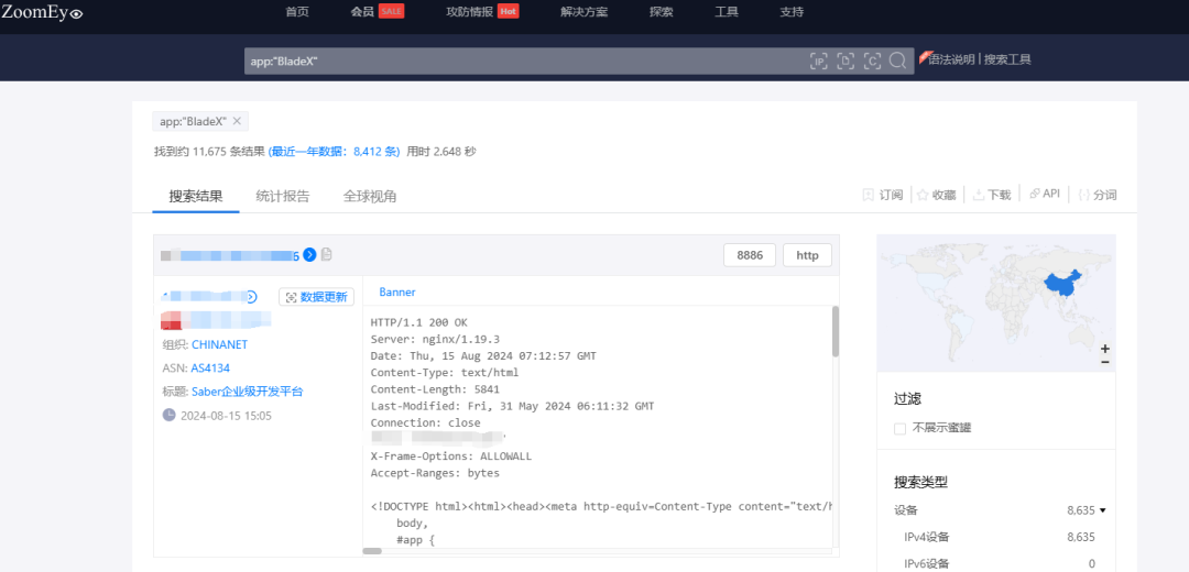 根据ZoomEye网络空间搜索引擎关键字 app:”BladeX” 对潜在可能目标进行搜索,共得到11675条IP历史记录。主要分布在中国、美国等国家。(ZoomEye搜索链接: