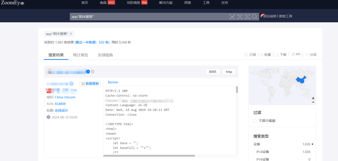 根据ZoomEye网络空间搜索引擎关键字 app:”积木报表” 对潜在可能目标进行搜索,共得到1083条IP历史记录。主要分布在中国、美国等国家。(ZoomEye搜索链接: