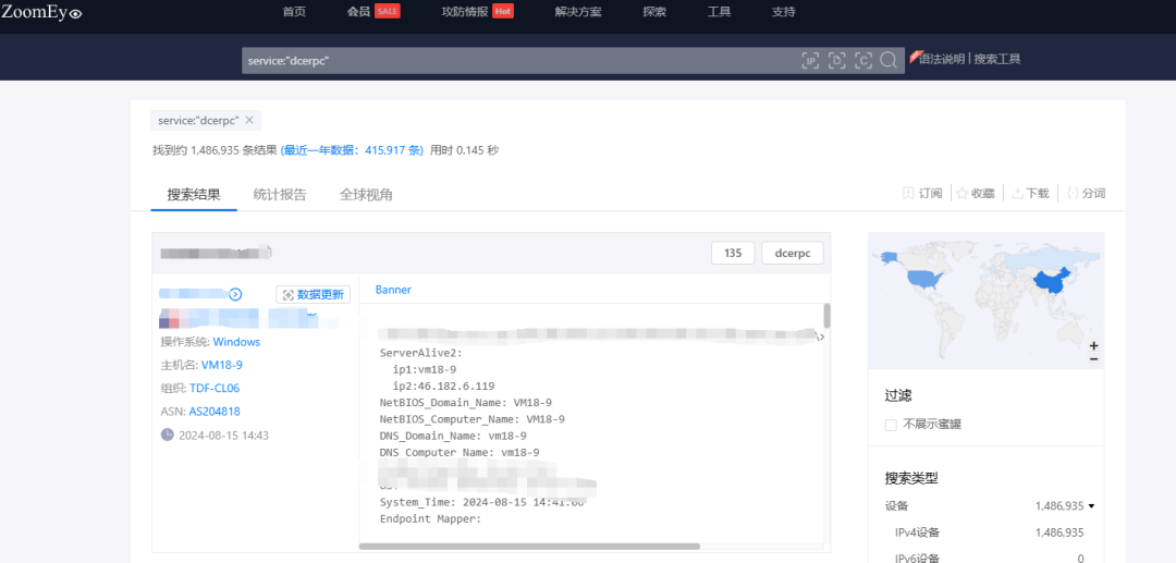 根据ZoomEye网络空间搜索引擎关键字 service:”dcerpc” 对潜在可能目标进行搜索,共得到1486935条IP历史记录。主要分布在中国、美国等国家。(ZoomEye搜索链接: