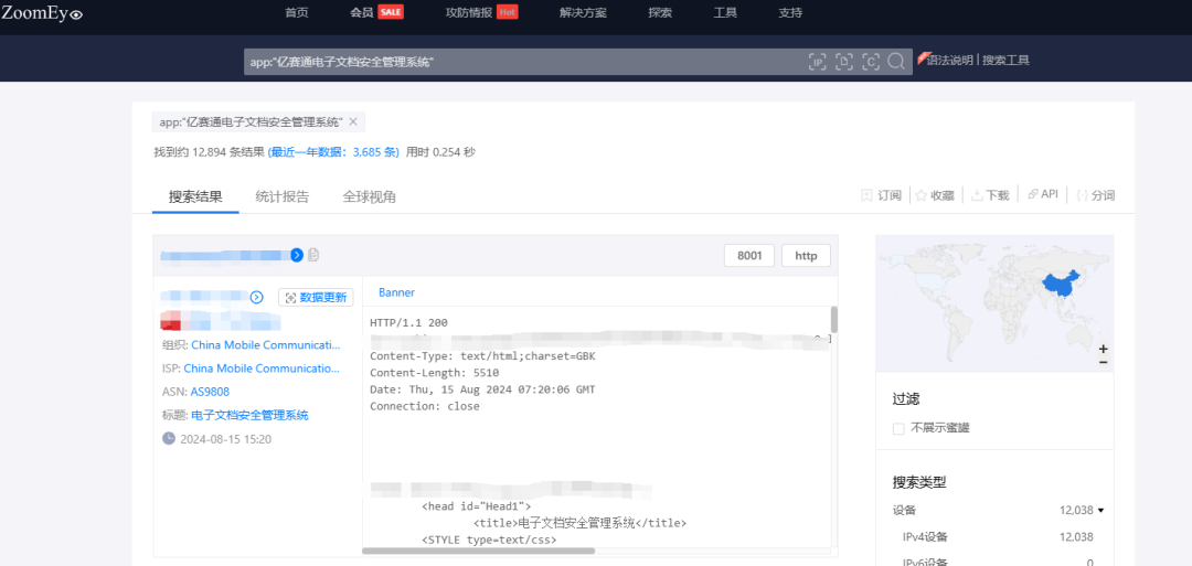 根据ZoomEye网络空间搜索引擎关键字 app:”亿赛通电子文档安全管理系统” 对潜在可能目标进行搜索,共得到12894条IP历史记录。主要分布在中国、阿拉伯联合酋长国等国家。(ZoomEye搜索链接: