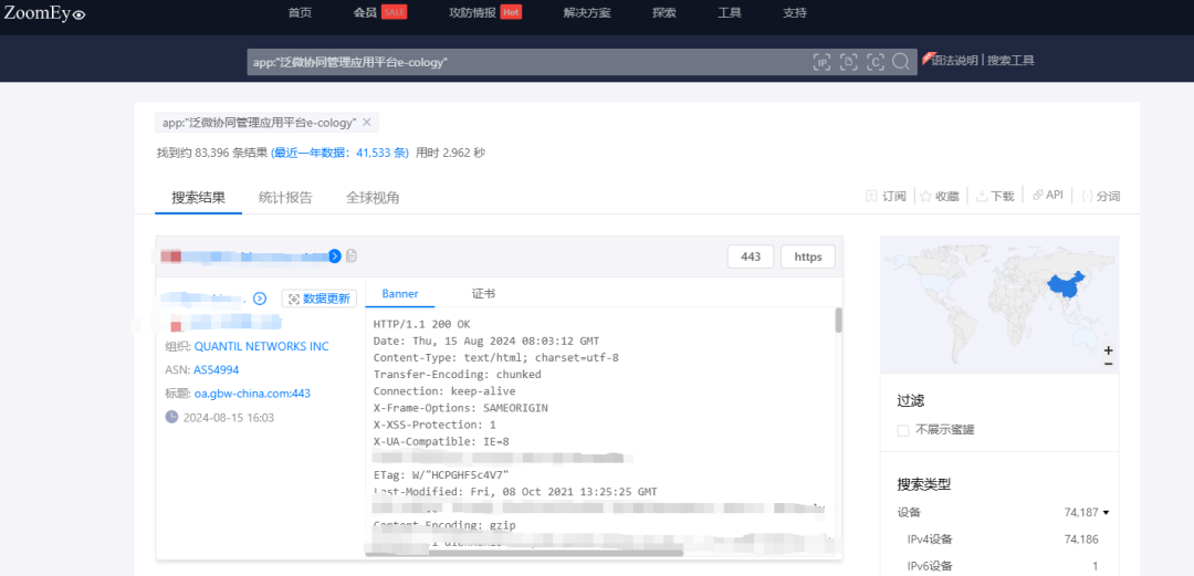 根据ZoomEye网络空间搜索引擎关键字 app:”泛微协同管理应用平台e-cology” 对潜在可能目标进行搜索,共得到83396条IP历史记录。主要分布在中国、美国等国家。(ZoomEye搜索链接: