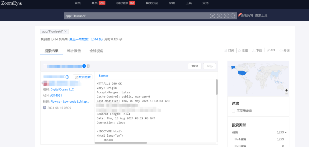 根据ZoomEye网络空间搜索引擎关键字 app:”FlowiseAI” 对潜在可能目标进行搜索,共得到5434条IP历史记录。主要分布在美国、印度尼西亚等国家。(ZoomEye搜索链接: