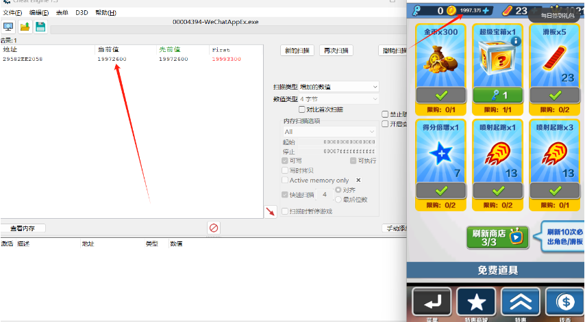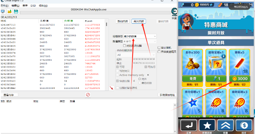 然后购买商品,点击减少的数值,再次扫描,多扫几次,最后出现一个或者几个或者十几个内存地址