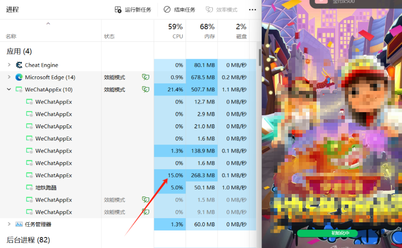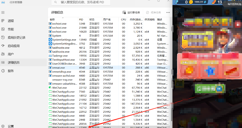 然后打开任务管理器搜索打开的小程序找到详情数值,一般打开小程序的时候,会有一个进程内存突然暴涨,就可以确认到。