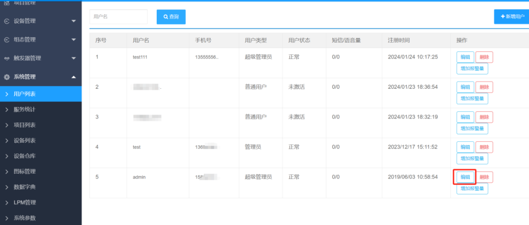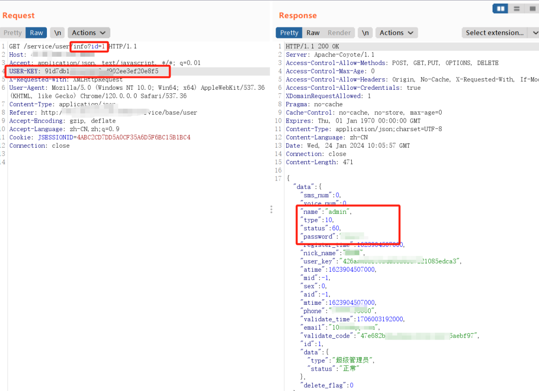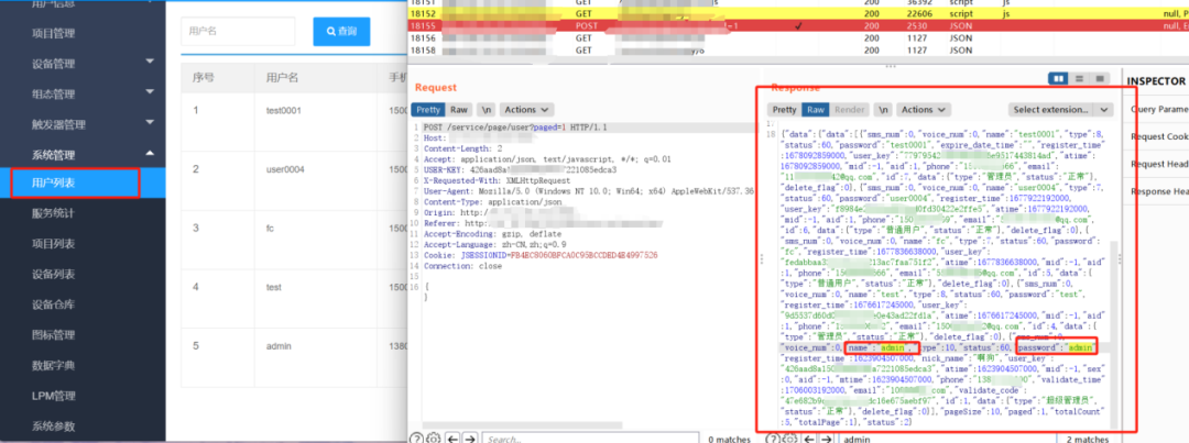 返回刚刚存在弱口令的系统继续测试,我们点进用户列表,然后在burp中查看返回包,可以看到用户列表的返回包中把所有的用户的信息以及账号密码和user-key都返回来了。