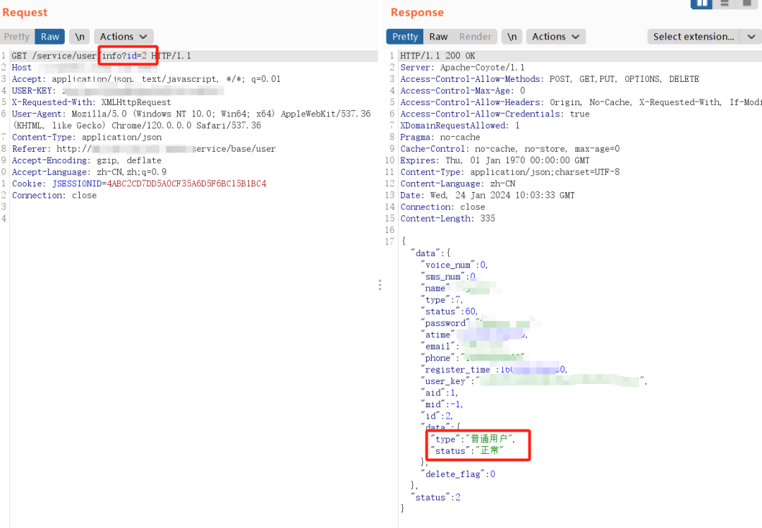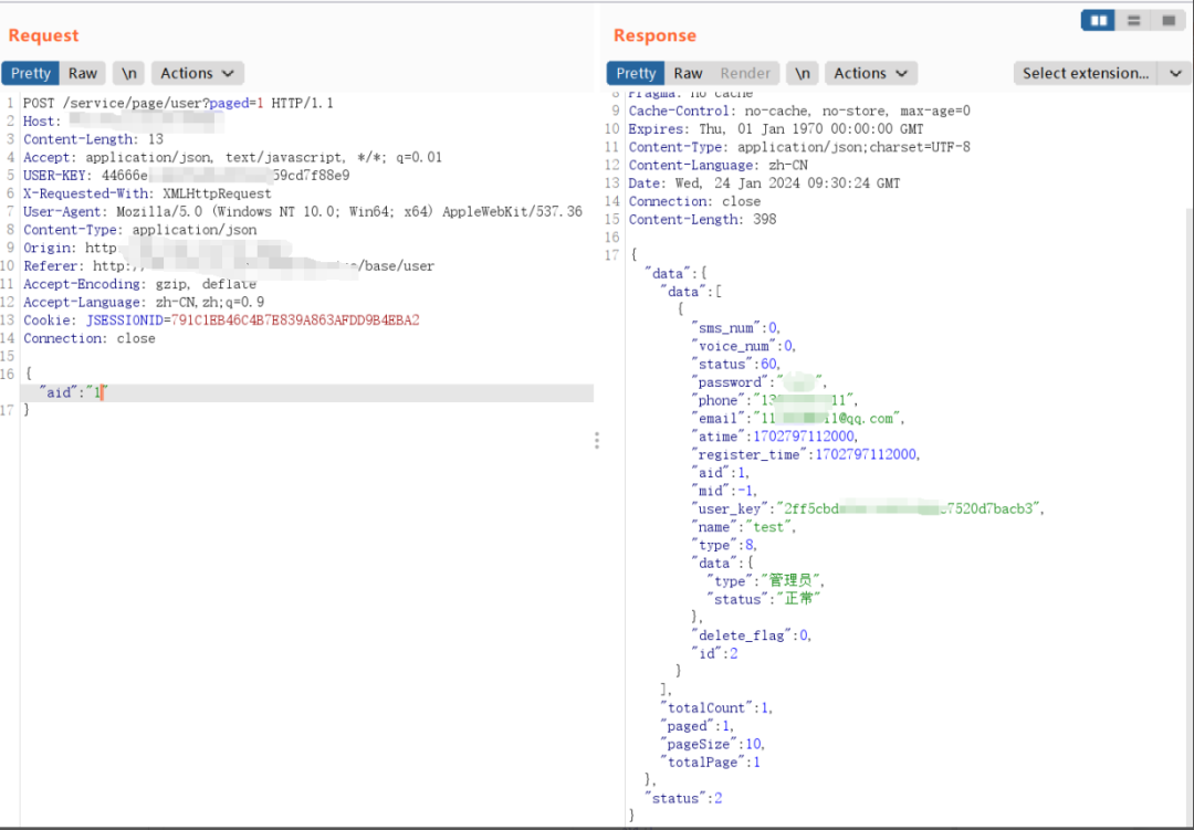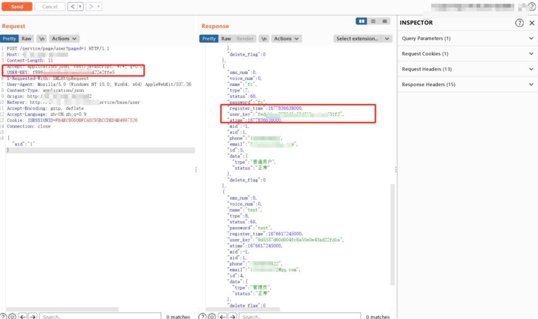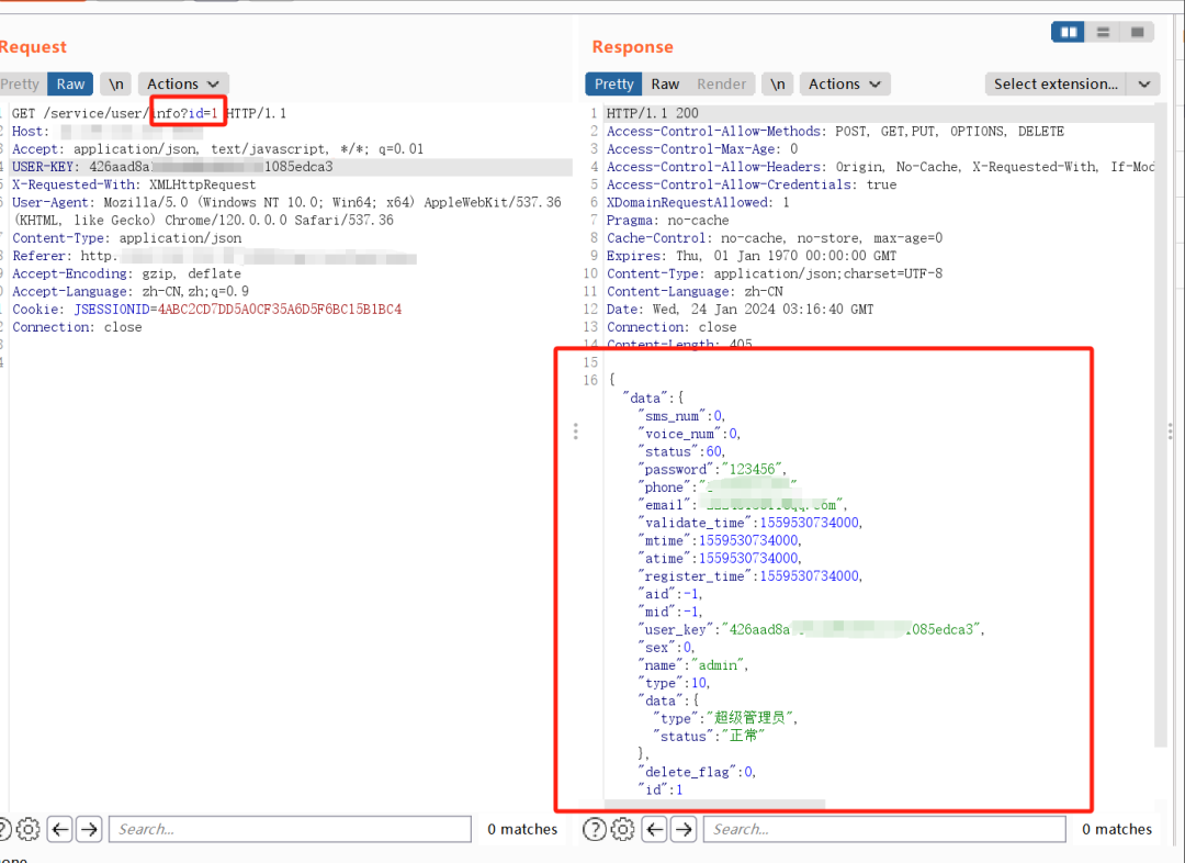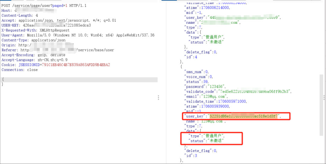 这时,我们尝试把数据包中的user-key替换成普通未激活用户的user-key,结果显示依旧可以越权查询到超级管理员账户的信息。