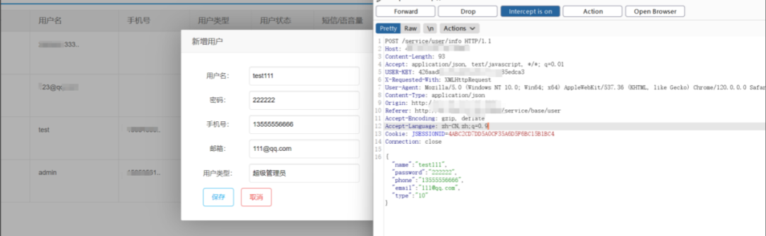 既然查不到,那我们看看能不能用刚刚注册的账号user-key直接创建一个管理员账号呢?这就需要先使用弱口令通过超级管理员账号登录系统,并创建一个超级管理员账号。此时,在burp中可以查看到创建用户的数据包,具体如下: