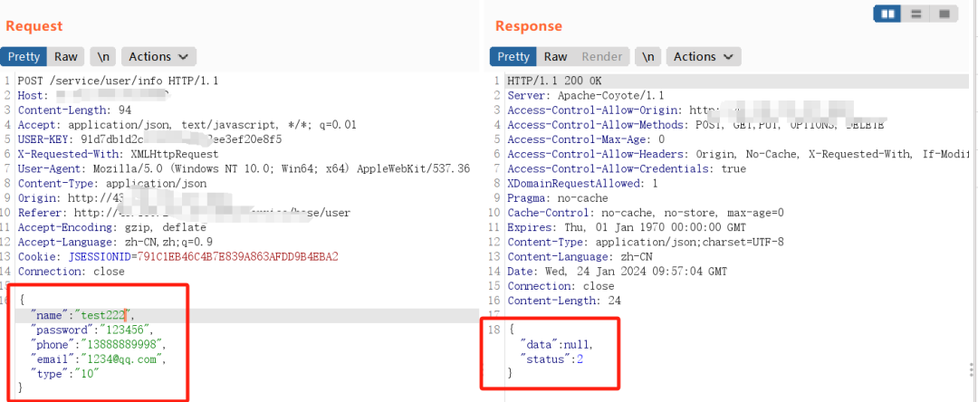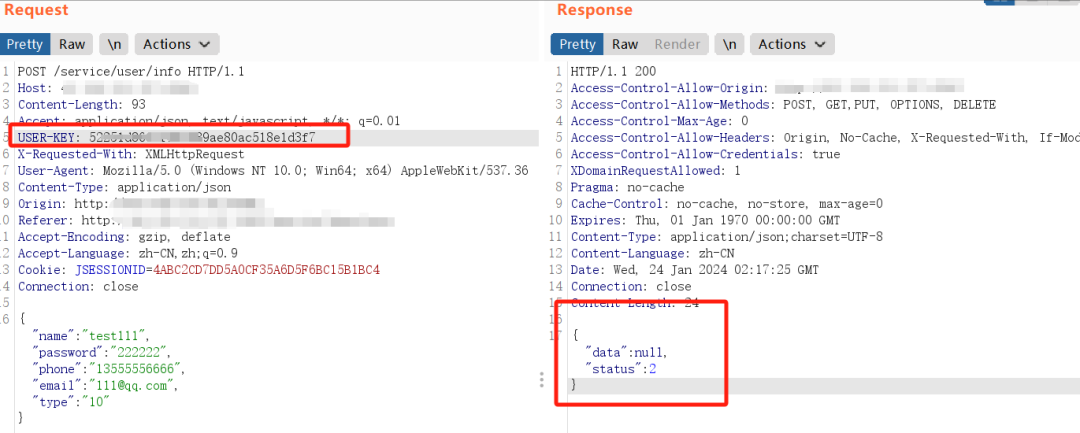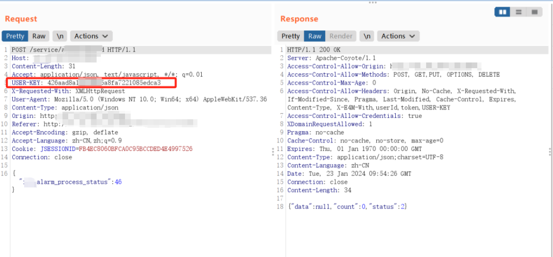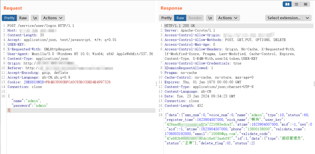 拦截一个数据包看看身份认证机制,通过以下数据包我们可以看到,这个系统的身份认证机制是通过账号+密码登录获取用户的user-key,后续的操作全部使用user-key进行校验。