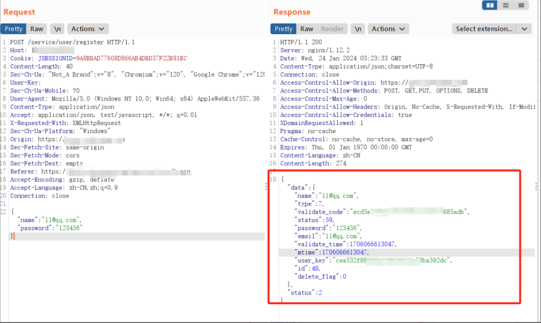这里猜测可能是开发人员将注册入口隐藏了,其实我们直接使用之前的注册数据包进行注册,修改数据包中的host然后发包,结果显示是可以注册的,并返回了用户的user-key。