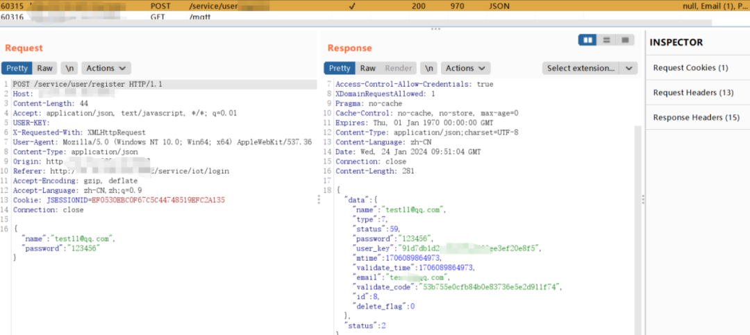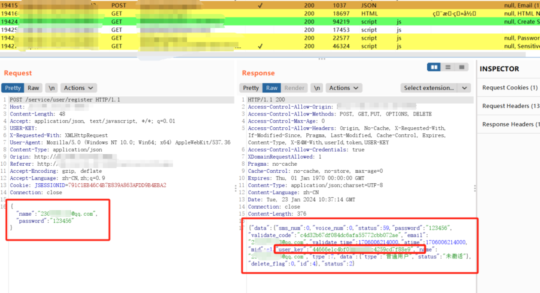 现在返回burp查看一下历史数据包。哦豁,有东西!此时,发现注册的数据包居然直接把刚注册用户的user-key带到返回包里了。如下: