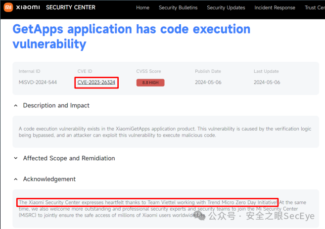 小米完美策划了这次攻击,他们在 Pwn2Own 比赛后删除了“GetApps”中的浏览器阻止代码,这使得攻击可以方便地再次发生。这种公司行为使研究人员无法从小米那里获得 CVE。此外,他们还发布了针对这些漏洞的安全公告。