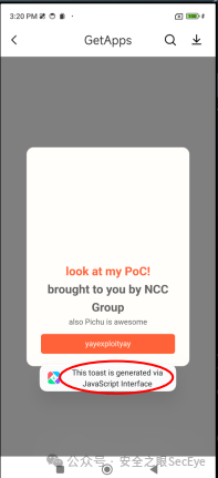 他们使用 DOM XSS 有效载荷执行 JS 接口并调用特权 WebView。此外,他们还注入了一个有效载荷,其中包含通过“ GetApps ”安装哪个应用程序的参数。