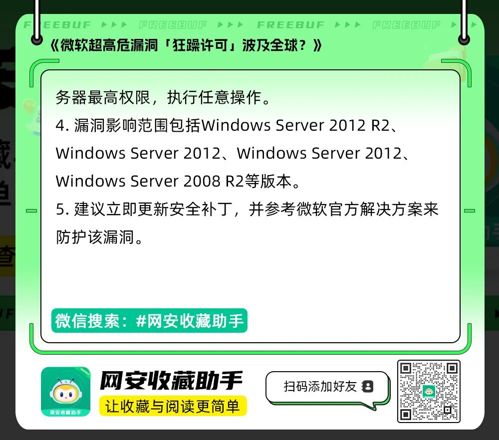 一旦漏洞被恶意攻击者或APT组织利用,将快速蔓延,或波及全球所有使用微软服务器的用户。这是自「永恒之蓝」后,Windows首次出现影响全版本且能高稳定利用的认证前RCE漏洞。建议尽快通过官网公告更新安全补丁。