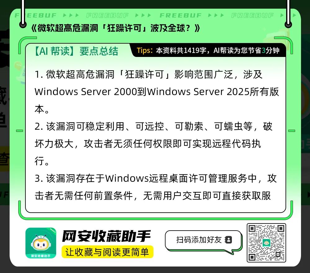 漏洞影响Windows Server 2000到Windows server 2025所有版本,已存在近30年。该漏洞可稳定利用、可远控、可勒索、可蠕虫等,破坏力极大,攻击者无须任何权限即可实现远程代码执行。