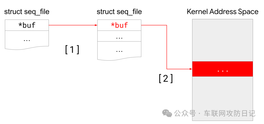 我们的 unlink 原语可以在内核中的任意可写地址写入,但它只能写入 0 或有效(即可写入)内核地址的值。为了实现更强大的任意写入(写入-写入-何处),我们选择利用基于 360 Alpha Lab 的台风 Mangkhut 利用链中提出的技术在 structseq_file对象中的指针字段 buf。