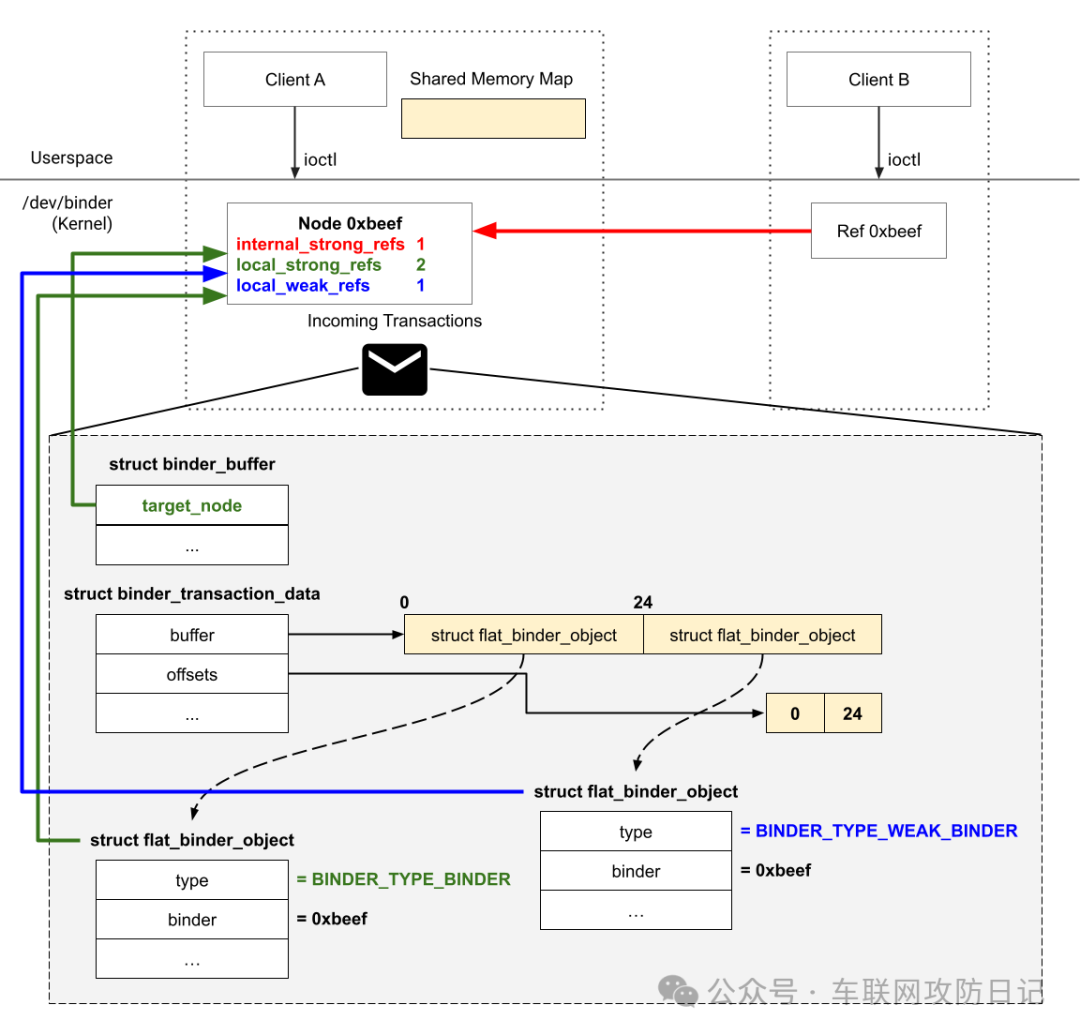 下面的图表说明了一个场景,其中客户端 A 有一个包含两个节点的传入交易,客户端 B 有一个引用 0xbeef( binder_ref)指向客户端 A 的节点 0xbeef( binder_node)。最重要的是,它突出显示了这些数据结构如何增加节点 0xbeef 的引用计数器。