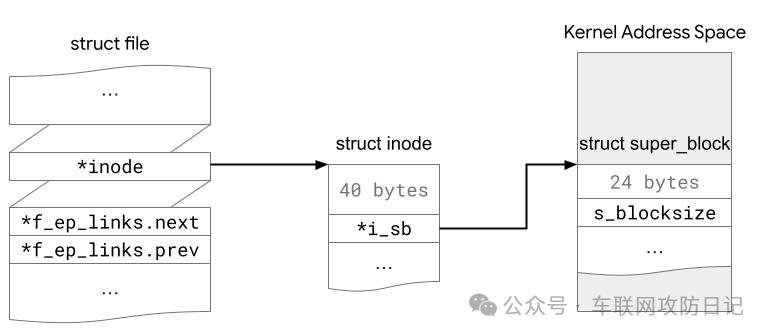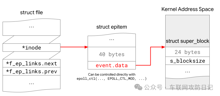 这两个内核指针( next 和 prev)形成了一个 structepitem对象的链表。链表的头部位于 structfile.f_ep_links。当我们使用泄漏原语将这些内核指针泄漏回用户空间时,其中一个指针将指向一个 structfile对象。