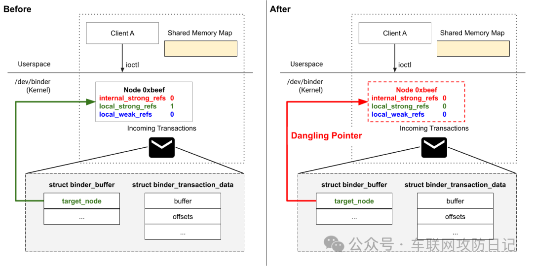 近年来,利用几个安全问题成功对 Binder 进行了多次攻击,主要是由使用后释放漏洞引起的。这些漏洞源于各种根本原因,包括不当的清理逻辑(CVE-2019-2215 和 CVE-2022-20421)、数据竞争(CVE-2020-0423)和对象内越界访问(CVE-2020-0041)。本博客提供了有关 UAF 问题的信息,这是由于在处理 Binder 事务时清理实现不当导致的引用计数错误。