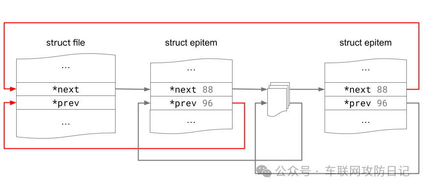 structepitem 包含两个内核指针( next 和 prev)分别在偏移 88 和 96。