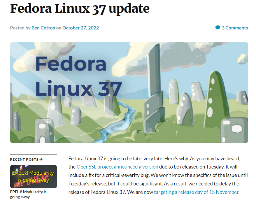 Fedora 又跳票啦!据 Fedora 项目经理 BEN COTTON 在博客中的介绍:因严重的 OpenSSL 漏洞,原定于 10 月中旬发布的 Fedora 37 将延迟至 11 月中旬发布。